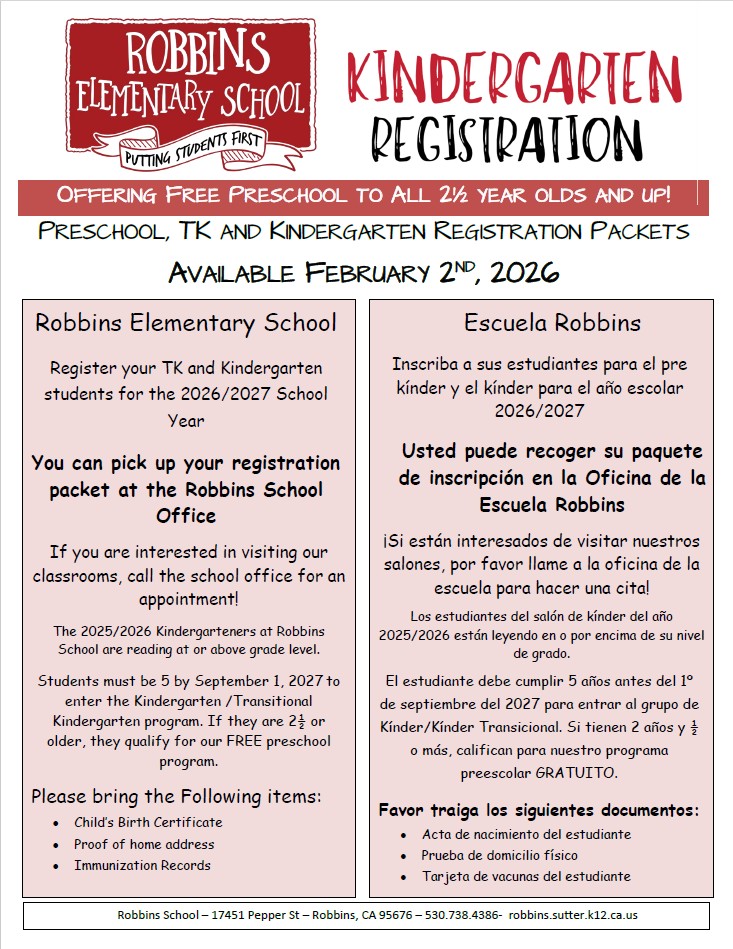 We offer open enrollment for all grades, small class size of 25 or less, and free transportation from Knights Landing. Registration packets are available at the Robbins School office.